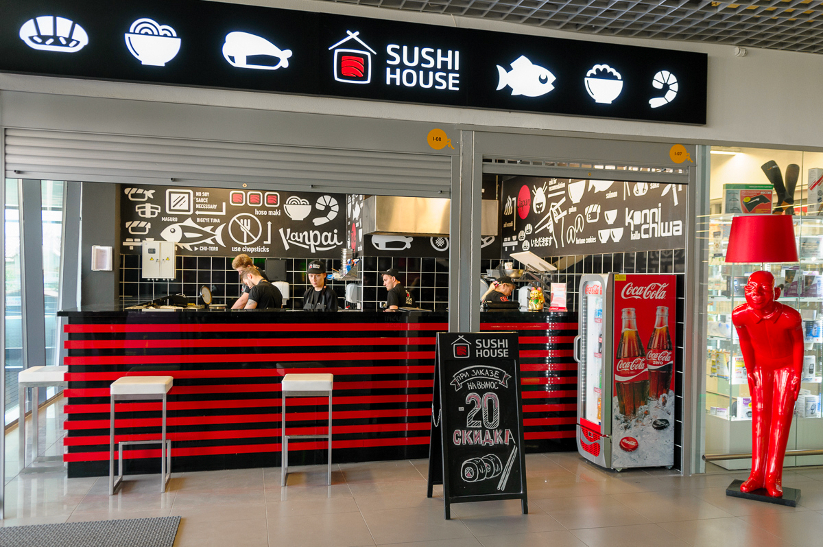 SUSHI HOUSE формата take away. В меню заведения представлены различные варианты суши и роллов, разнообразные салаты, рис, лапша WOK. При заказе на вынос действует постоянная скидка 20%. В барном меню представлено кофе на вынос и разливное пиво.
